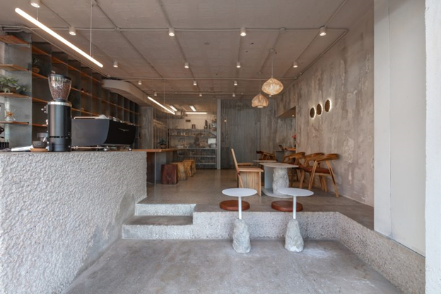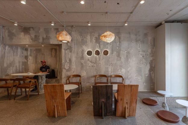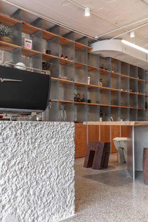 Планировка кафе была стратегически продумана: стойка располагалась как можно ближе к тротуару. Это решение направлено на интеграцию с окружающей средой и способствует социальному взаимодействию городской жизни. Стойка, построенная из монолитного бетона и сделанная вручную, дополняется сиденьями возле входа, что позволяет использовать разницу в высоте между интерьером и экстерьером кафе, создавая динамичное пространство.